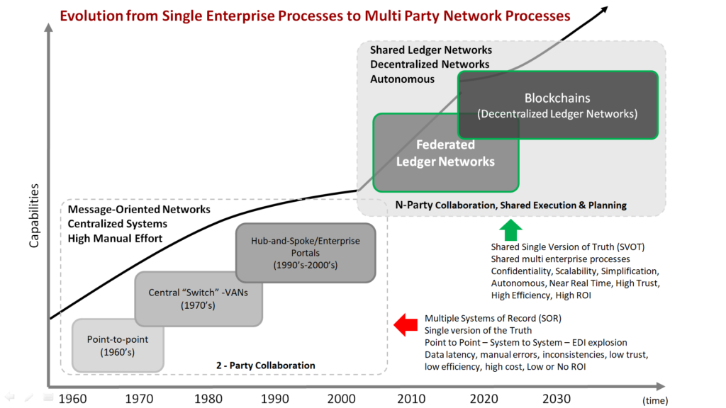 This landscape forces a proliferation of manual fill-in-the-gap processes between systems and companies. This “mess” has spawned entire consulting industries and esoteric complex point software solutions. It is also one of the drivers behind many “data lake + analytics” and experimental blockchain projects by companies struggling to become more efficient and agile.